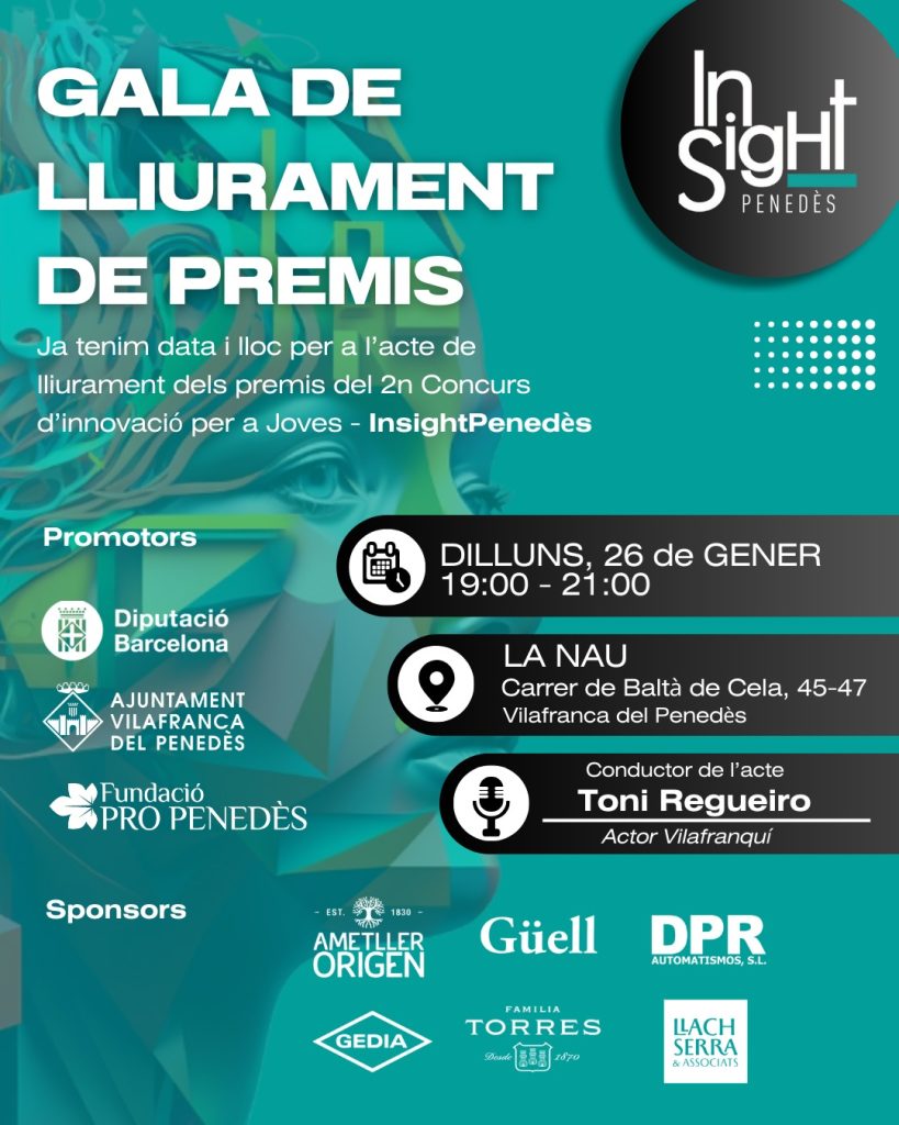 El proper dilluns 26 de gener, a les 19 h, La Nau de Vilafranca del Penedès serà l’escenari de l’acte de lliurament de premis de la segona edició del Concurs d’Innovació per a Joves InsightPenedès, una iniciativa impulsada per la Fundació Pro-Penedès amb el suport de la Diputació de Barcelona i l’Ajuntament de Vilafranca del Penedès.